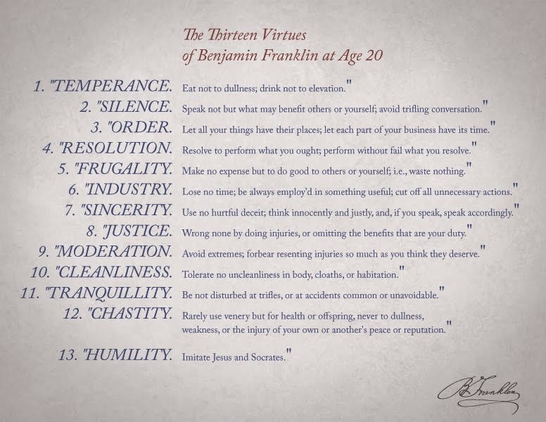 He began drafting a plan: each week, for 13 weeks, he’d focus on a single virtue to pursue. After those 13 weeks he would start over—running through the cycle 4 times by the end of the year.